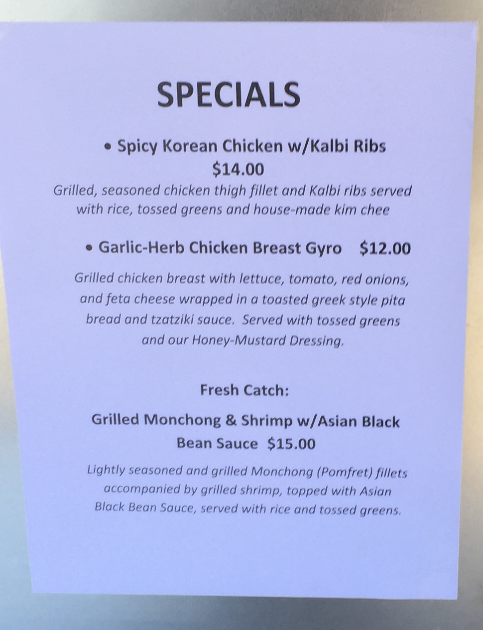 I love cruising the back side of Diamond Head. Before getting married I actually ran 5 miles around Diamond Head and Kapiolani Park 5-6 days a week because I liked the runners rush, being outdoors, seeing shorts and bikinis and I had no money to do anything else. Running was a big part of my life back then and eating was usually a bowl of Ramen Noodles. Diamond Head Market and Grill was on my running route as I ran up Monsarrat Avenue toward Kapiolani Community College and the entrance to Diamond Head Crater. Fast forward to today and I drove right up and parked in front of Diamond Head Market and Grill. We walked up to the window where you place your order and reviewed the menu of Burgers, Sandwiches, Plate Lunches and Salads. I popped my head in the window and saw a cook on the line at my left. He was cooking on the grill but turned to the window and looked at me. Seemed a bit pissed off that he had to cook and work the window. He did not say much but started to take our order. After he took our order another man came to the window and took over so the cook could return to the grill. Trying to keep in healthy, I went for one of the Daily Specials. The Garlic Herb Chicken Breast Gyro ($12). Tasted like a regular Gyro but with chicken. Not bad at all. Served with Romaine Lettuce with a Honey Mustard dressing. The Dressing was light and they did not over pour it on the lettuce so I liked it. The Spicy Korean Chicken with Kalbi Ribs ($14) was a nice plate of food. The Chicken was not too spicy but had a good flavor. The Kalbi Ribs were delicious. Served with Rice, Kim Chee and Salad. Everyone liked the Kim Chee here. The Kalbi Beef Rib Plate ($13.75) put a smile on my Daughters face. She was quite quiet as she emerged herself into the ribs as she chew the fat off the bones and then sucked them clean. The Kalbi Ribs here are excellent. Food here while not cheap is quality and good. There is also a small market where you can buy pre-made sandwiches, salads and entrees to take home or to a picnic. They also have some really tasty looking Scones and desserts too. Great place to pick up supplies for a day at the beach.